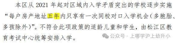 本区 从 2021 年起对区域内入学矛盾突出的学校逐步实施“每户房产地址五年内只享有一次同校对口入学机会(多胞胎、多孩除外) ”。不符合此项政策的适龄儿童和学生,由松江区教育考试中心 统筹安排入学 。