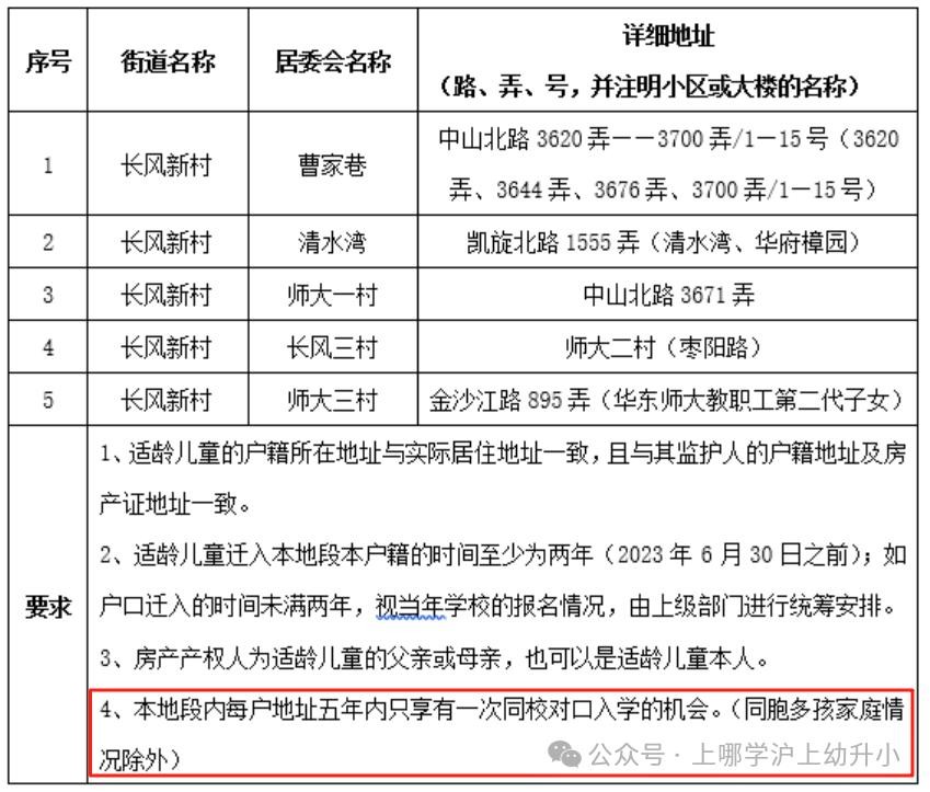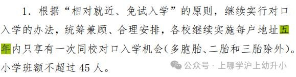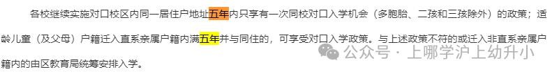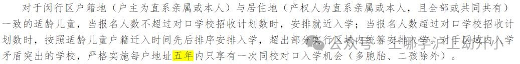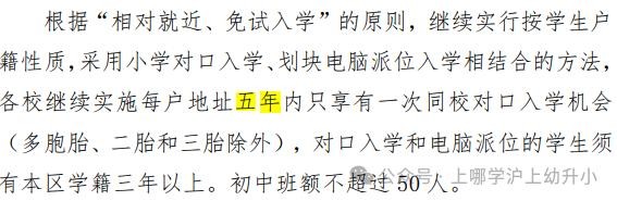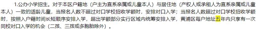 各校继续实施对口校区内同一居住户地址五年内只享有一次同校对口入学机会 (多胞胎、二孩和三孩除外)的政策;适龄 儿童(及父母)户籍迁入直系亲属户籍内满五年并与同住的,可享受对口入学政策 。与上述政策不符的或迁入非直系亲属户籍内的由区教育局统筹安排入学。