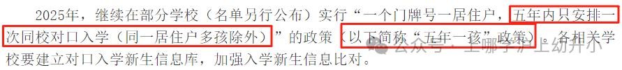 2025年,继续在部分学校 (名单在下面)实行“一个门牌号一居住户, 五年内只安排一次同校对口入学(同一居住户多孩除外)”的政策(以下简称“五年一孩”政策) 。各相关学校要建立对口入学新生信息库,加强入学新生信息比对。