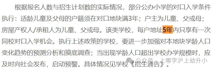根据报名人数与招生计划数的实际情况, 部分公办小学的对口入学条件执行 :适龄儿童及父母的户籍须在对口地块满3年;户主为儿童、父或母;房屋产权人/承租人为儿童、父或母。该类学校, 每户地址5年内只享有一次同校对口入学机会 。执行上述政策的学校,要进一步加强对本地块学龄人口变化趋势的预测分析和摸底调查;当出现学龄人口超出学校办学规模时,应及时向社会发布,启动预警。