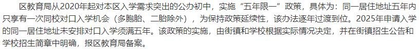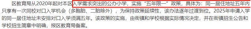 区教育局从2020年起对本区入学需求突出的公办小学,实施 “五年限一” 政策,具体为: 同一居住地址五年内只享有一次同校对口入学机会(多胞胎、二胎除外),为保持政策延续性,该办法逐年过渡到位。2025年申请入学的同一居住地址未安排对口入学须满五年。 该政策的实施,由街镇和学校根据实际情况决定,并在街镇招生公告和学校招生简章中明确,报区教育局备案。