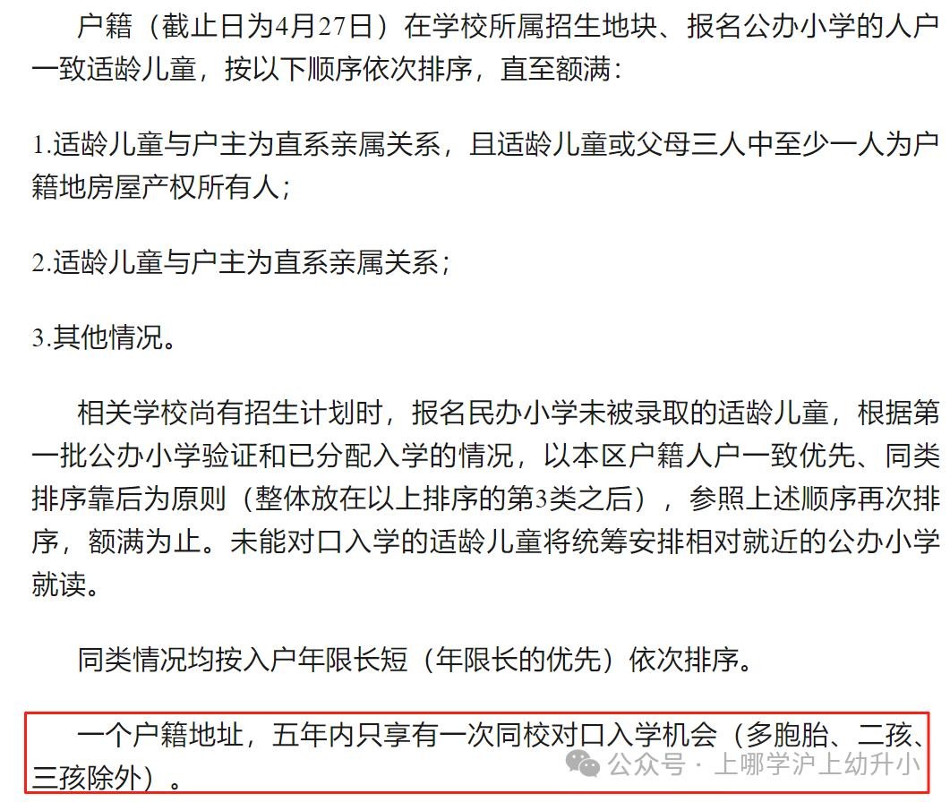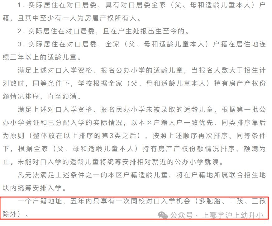 虹口区2025年秋季小学招生告示 中表明: 一个户籍地址,五年内只享有一次同校对口入学机会(多胞胎、二孩、三孩除外)。