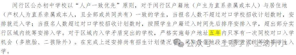 闵行区2017年开始实施五年一户,2025年政策中表明 小学和初中都是入学矛盾突出的学校实施五年一户 。