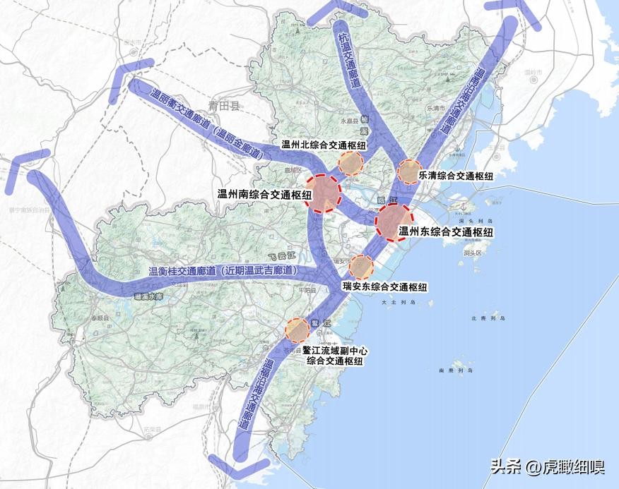 以温州东综合交通枢纽为中心,规划5条综合交通廊道: