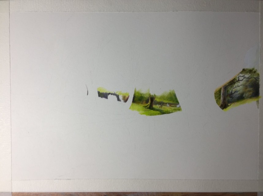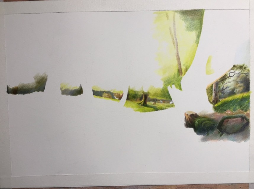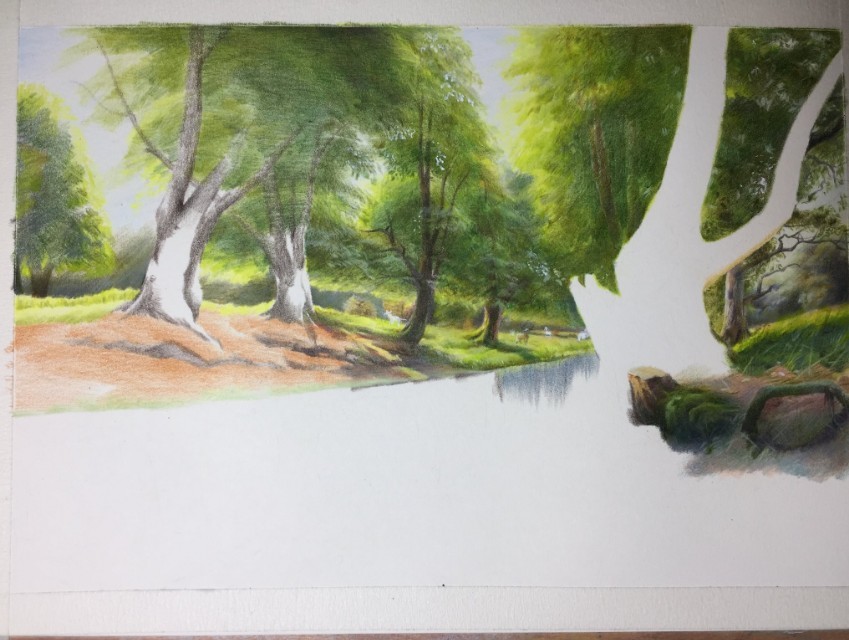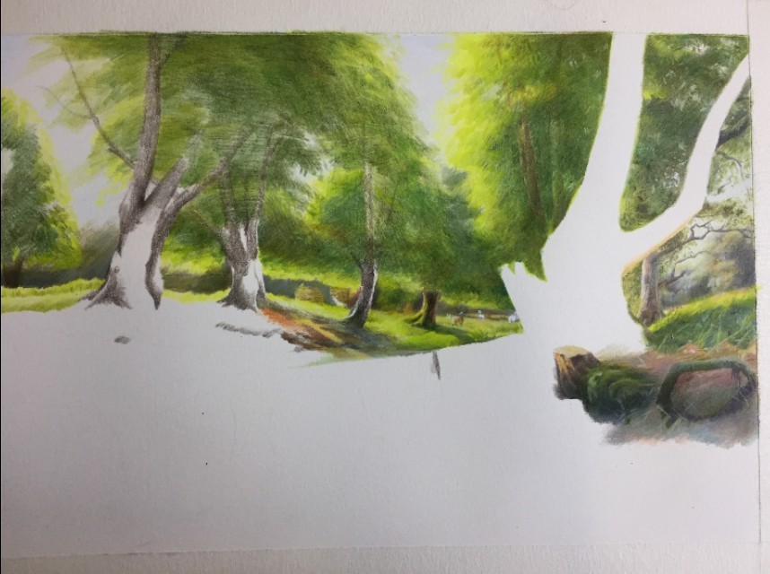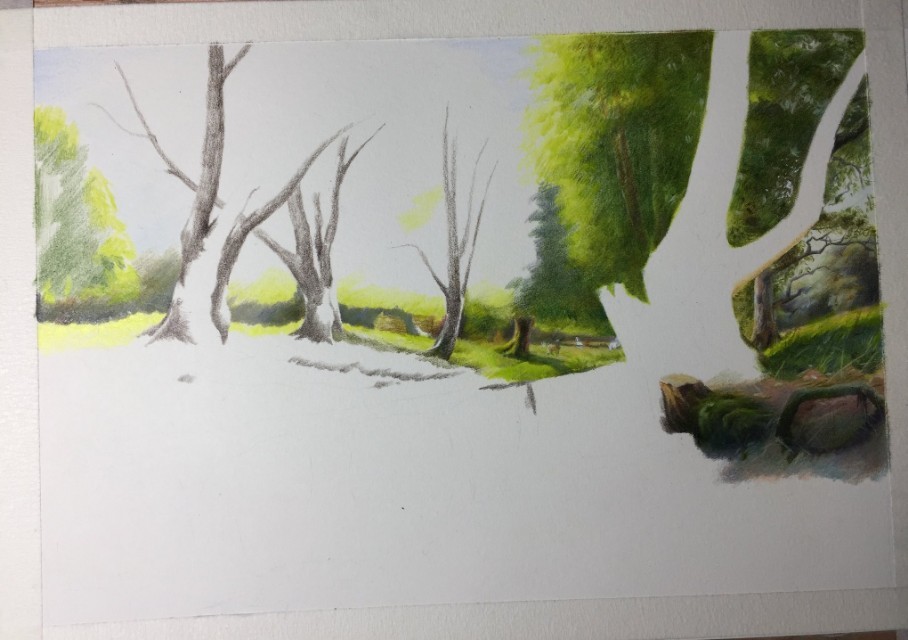 2:由远景开始往中景的树开始去铺色,注意树杆子一般用到的颜色是熟褐加浅绿再加灰色