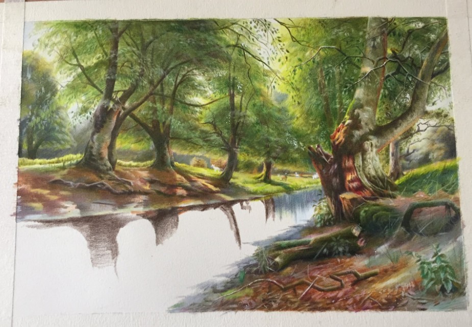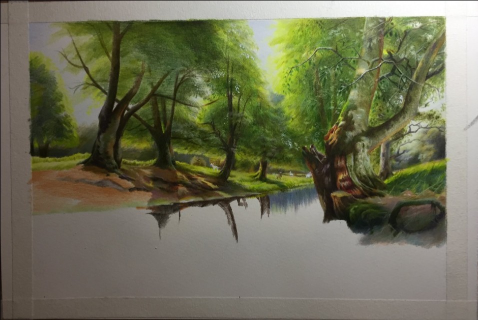 8:河面倒影用熟褐先收型,然后用浅灰绿加橄榄绿去画倒影,有些地方可以加黄绿色进去,让纯度高一点