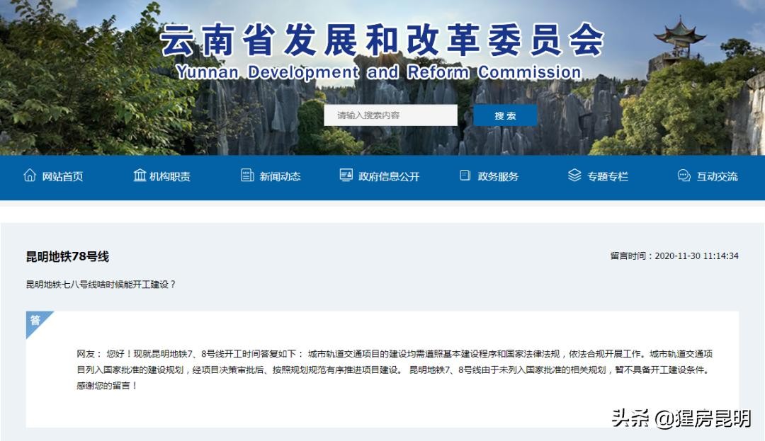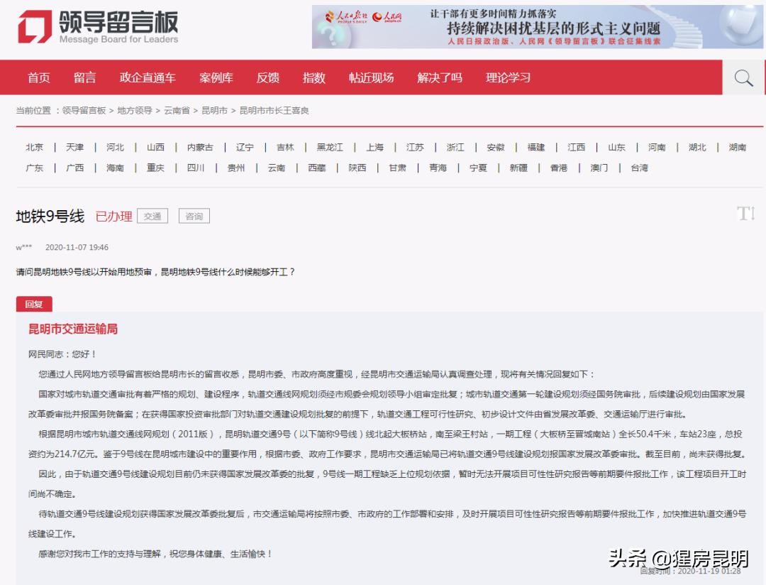 但从昆明市交通运输局在人民网领导留言板的回复得知,昆明市交通运输局已将地铁9号线建设规划报国家发展改革委审批,截至目前,尚未获得批复。