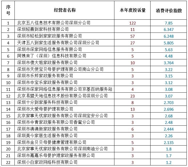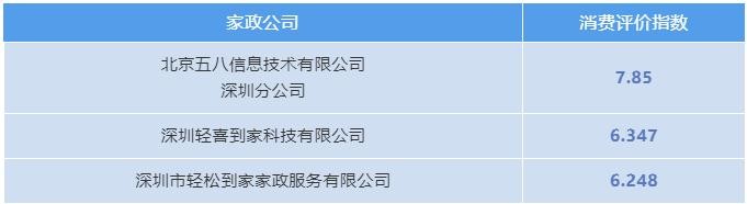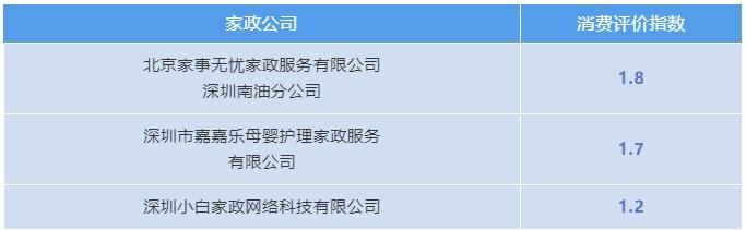 本次公布的深圳市消委会家政行业消费评价指数排行榜中,深圳市乐邦家政服务有限公司(3.15)、北京家事无忧家政服务有限公司深圳宝安分公司(2.68)、北京家事无忧家政服务有限公司深圳南油分公司(1.8)、深圳小白家政网络科技有限公司(1.2)等4家经营者未建立投诉处理便捷通道,投诉处理效率较低,增加了消费者维权成本,消费者应谨慎选择。