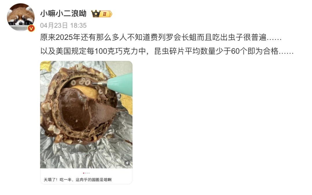 对此,有博主表示:原来2025年还有那么多人不知道费列罗会长蛆而且吃出虫子很普遍……