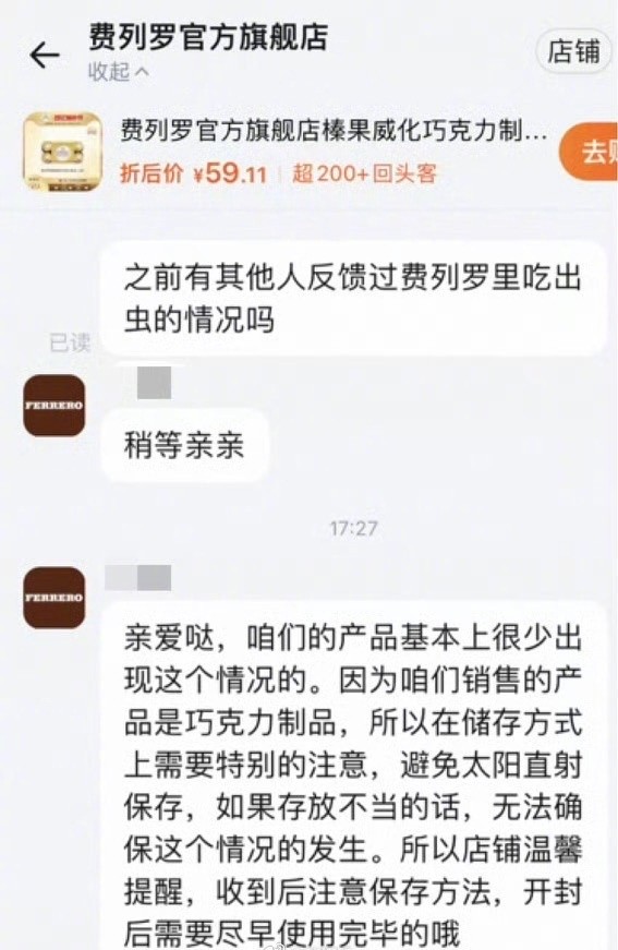 费列罗长蛆?网友:一口闷的天塌了……旗舰店客服最新回应!