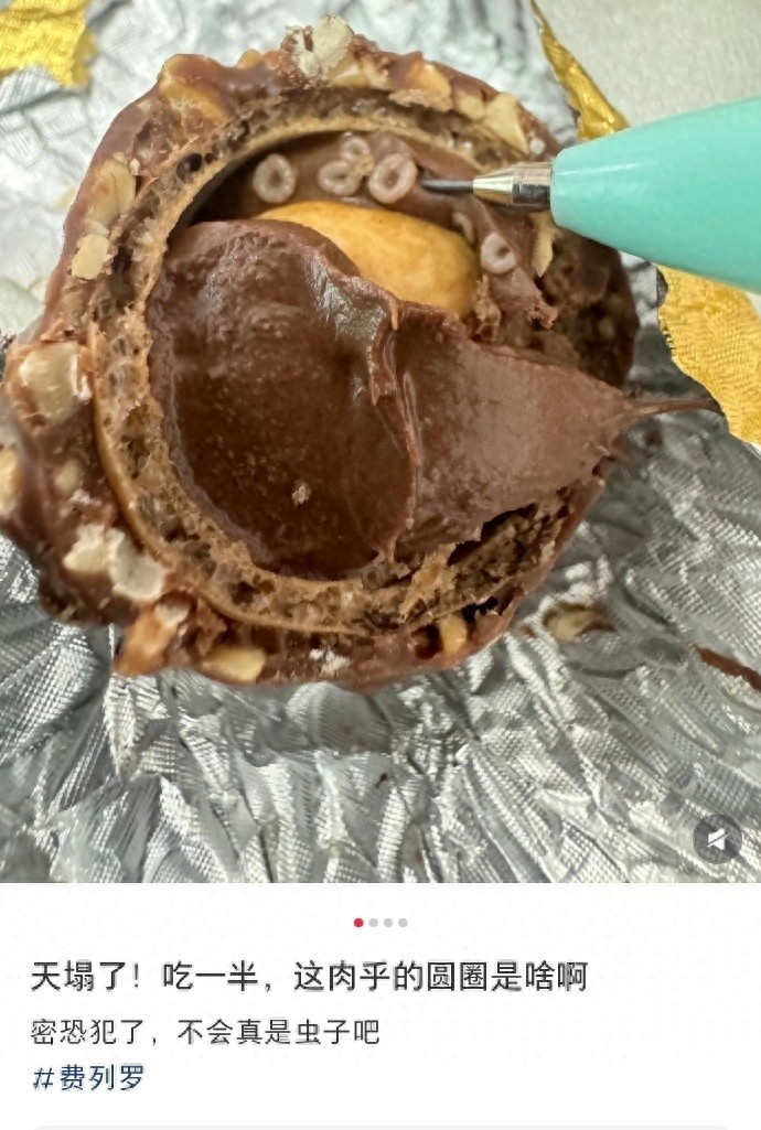 近日,有网友晒出巧克力中疑似长蛆的图,并配文“天塌了!吃一半,这肉乎的圆圈是啥啊密恐犯了,不会真是虫子吧”,底下还打着“#费列罗”的标签。
