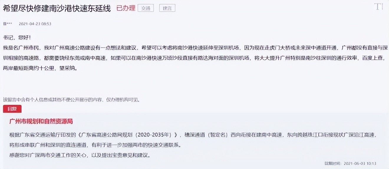 尽快修建南沙港快速东延线的建议,希望可以考虑将南沙港快速延伸至深圳机场。