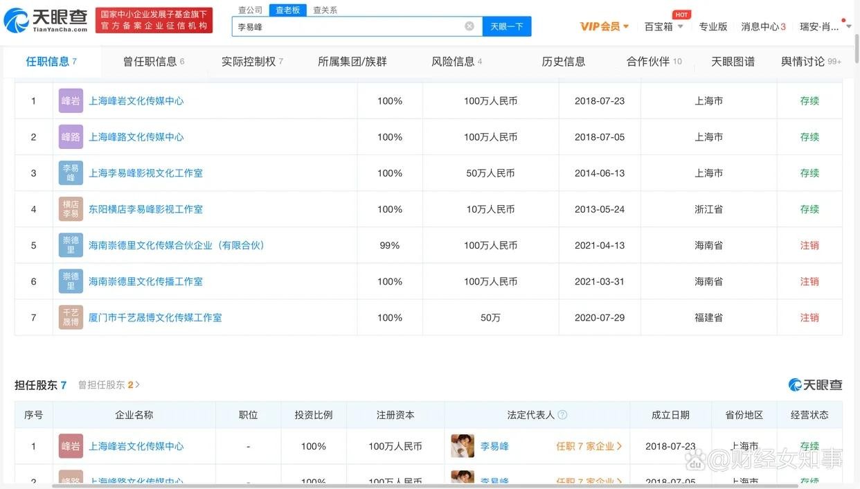 不过,值得注意的是,今年3月开始,李易峰开始陆续注销了其名下多家工作室。