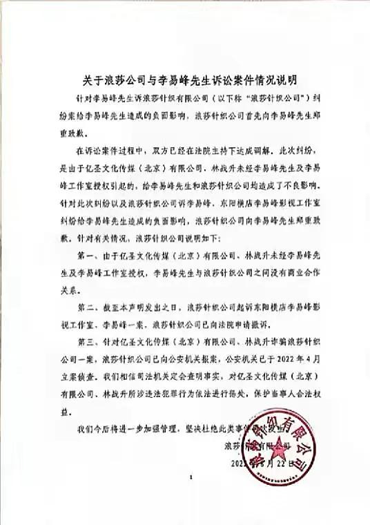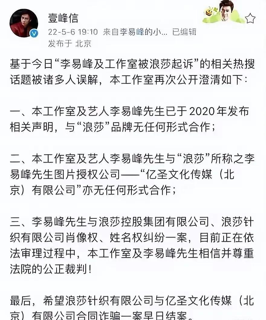 据悉,2022年8月25日,浪莎与李易峰的肖像权争议以浪莎向李易峰公开道歉落幕