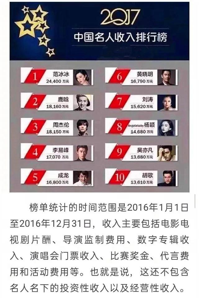 据查,在2015年到2017年,仅仅两年的时间,李易峰在公布的福布斯中国名人排行榜,他的年收入已经由6900万到涨到了1.7亿元,排名也由第七名涨到第四名。
