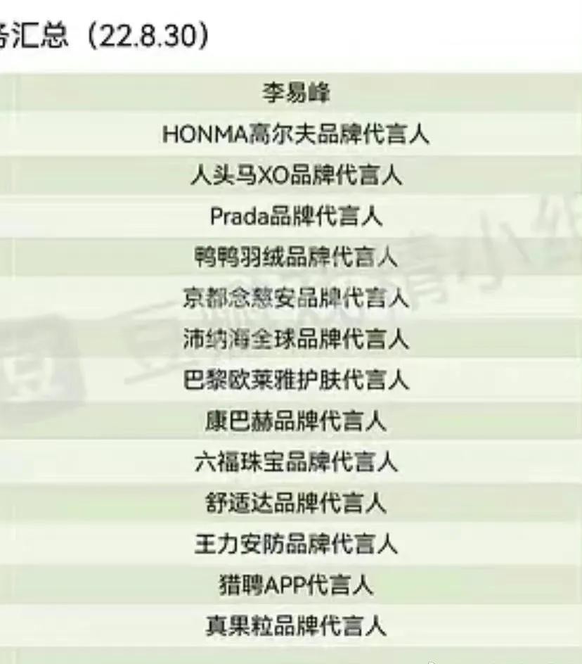 也随着李易峰迅速窜红,几十个品牌代言拿到手软,从食品饮料、电子产品、日用品到软件、服装配饰等领域,应有尽有。