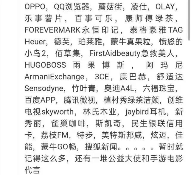 2020年至今,其商业代言超13个,其中多是巴黎欧莱雅品牌、人头马、六福珠宝等知名品牌。
