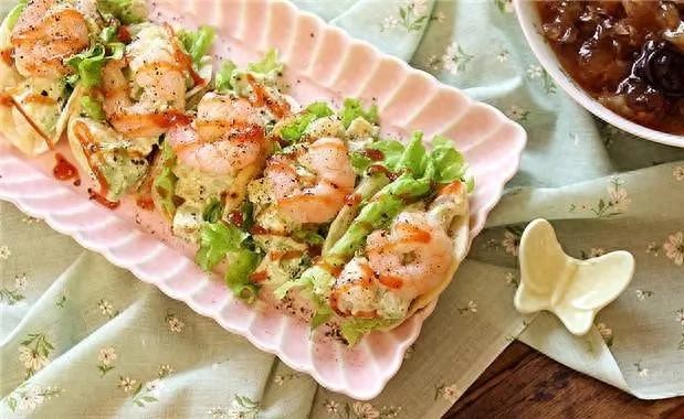 食材:饺子皮1,虾仁适量,牛油果1个,生菜3片,胡椒粉,盐各适量,沙拉酱2勺,番茄酱少许。