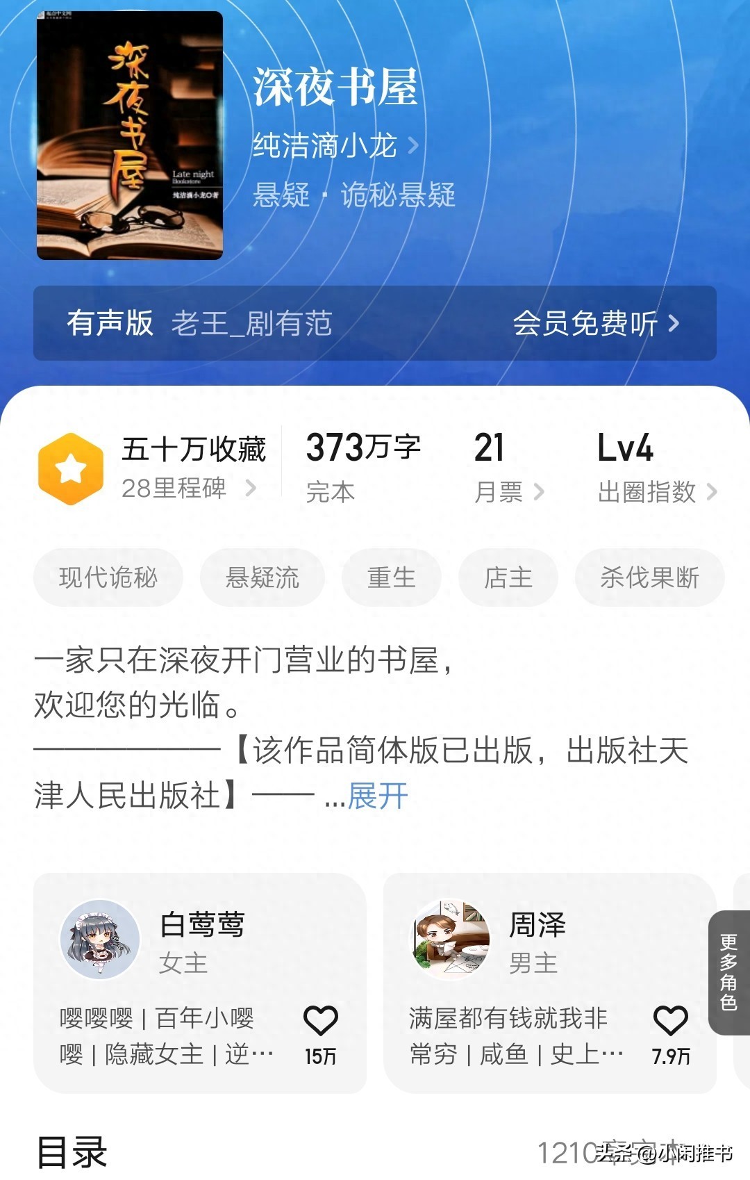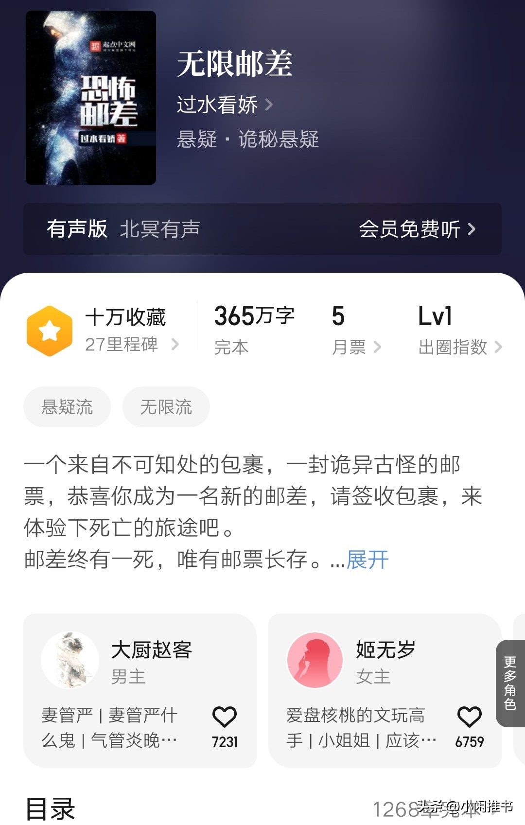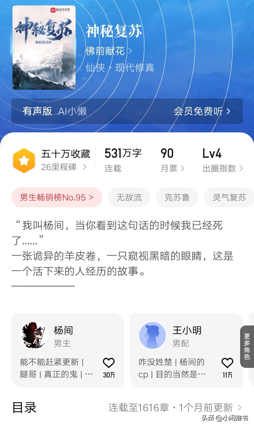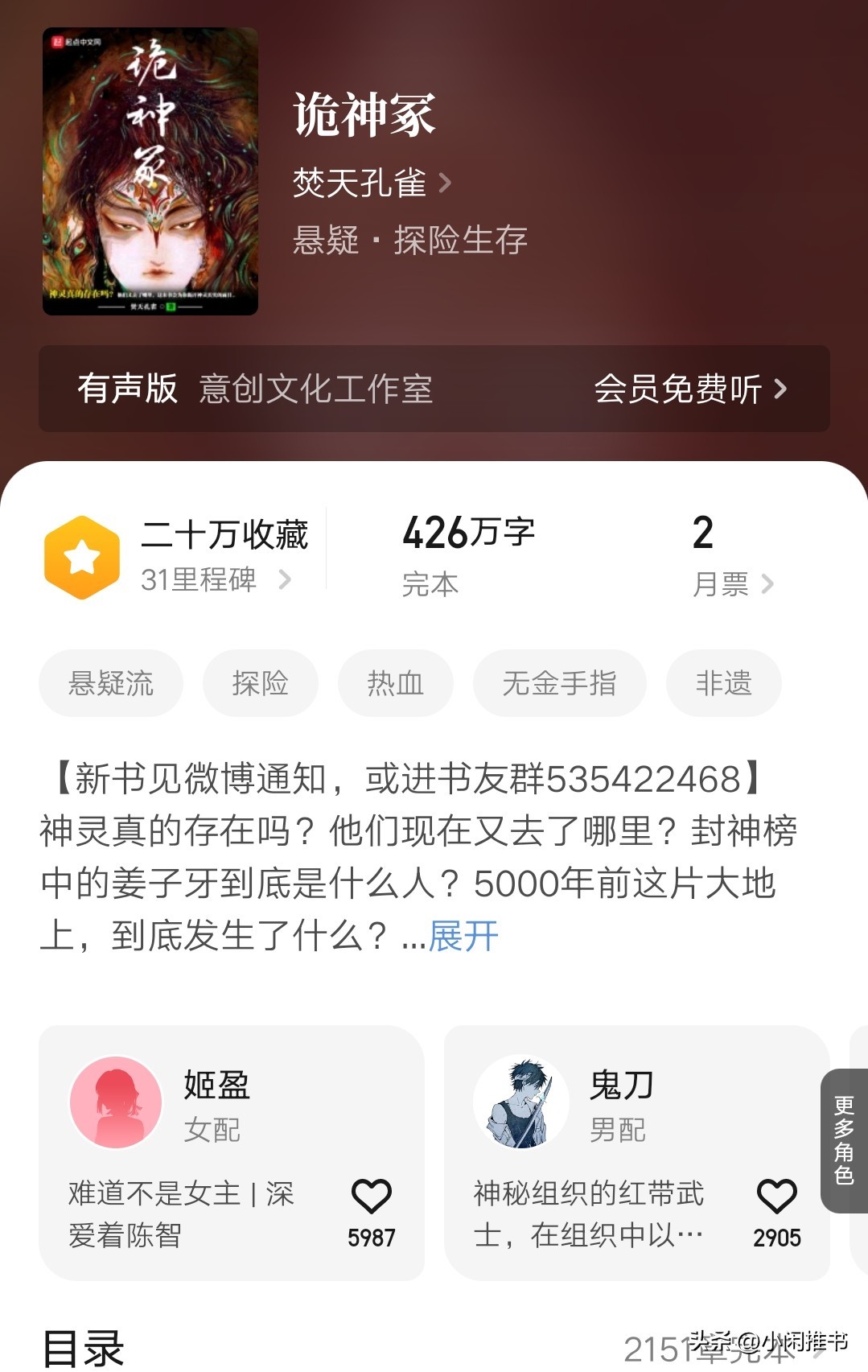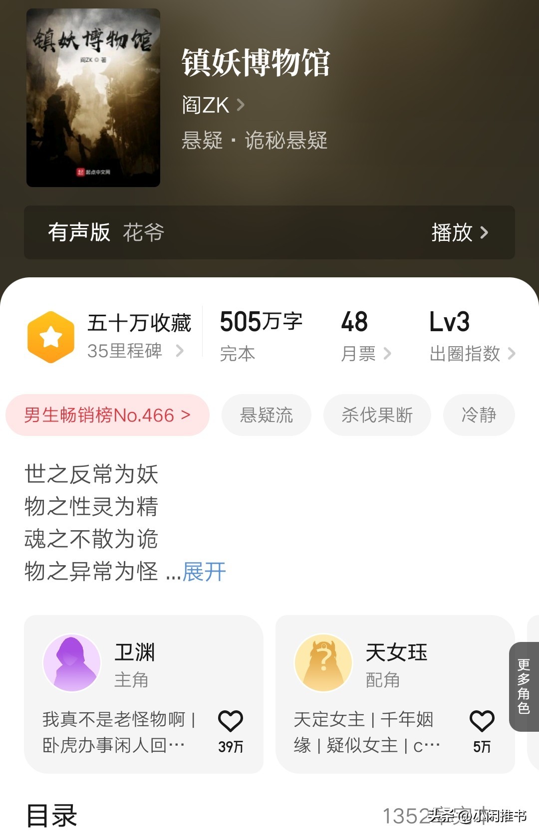点评:妖鬼现世,主角传承古代妖管职务镇压各处乱象的故事。灵气复苏世界,主角获得古代司隶校尉,靠斩杀妖鬼获得新功法或者宝物。开头以为要走灵异恐怖路线,但后边转成现代聊斋+迪化流。