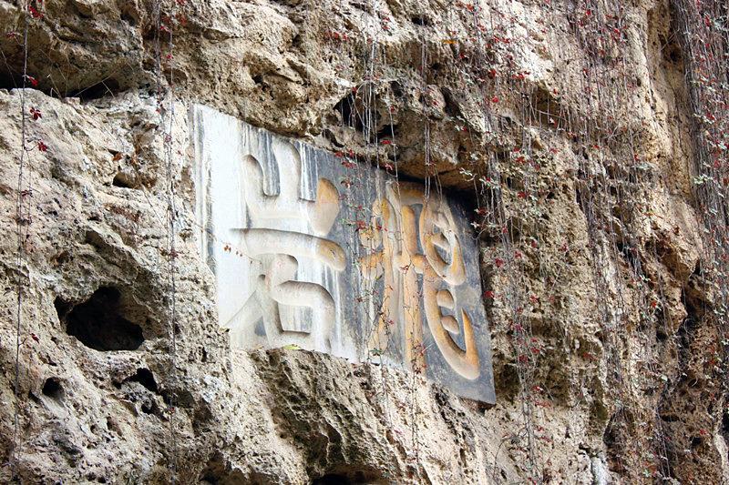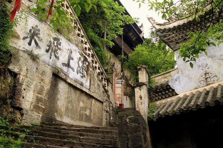 紫阳书院,以祀朱文公朱熹号紫阳之名而来。对面悬崖上书“飞岩”二字,笔力苍劲。紫阳书院由三角亭、考祠、老君殿、圣人殿组成。三角亭是一座比较罕见的亭子,牌匾上的“谐趣”二字代表儒、释、道三教文化在此和谐共存的景象。