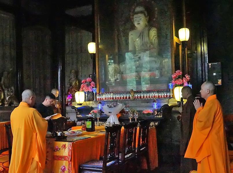 大佛殿庄严肃穆,上方横额“大雄宝殿”贴金大字,系赵朴初手笔。殿内供奉一尊玉佛,由整块的缅甸玉雕琢而成,高2.2米,重约8吨,是贵州省内最大的玉佛。